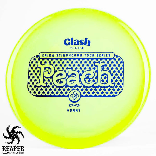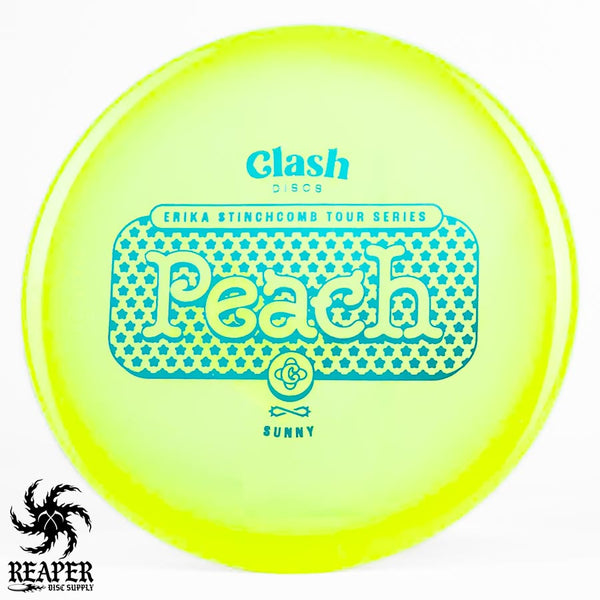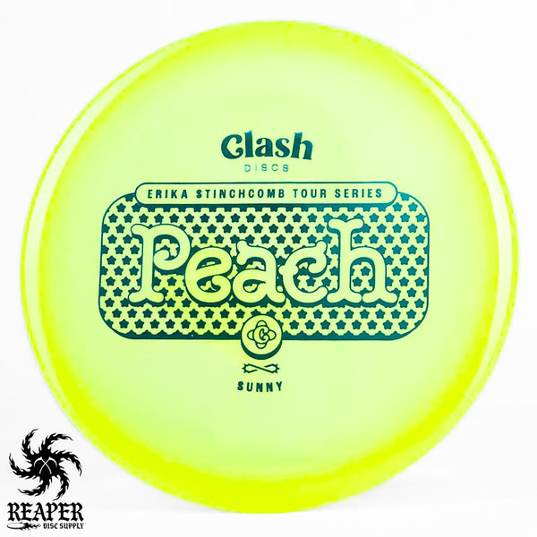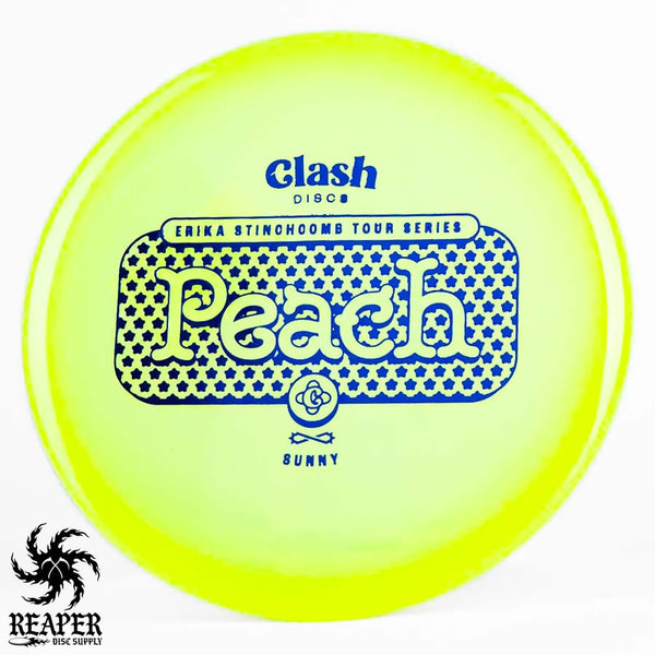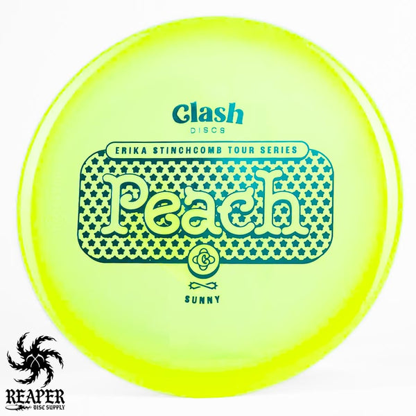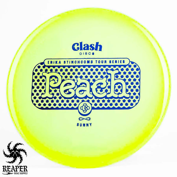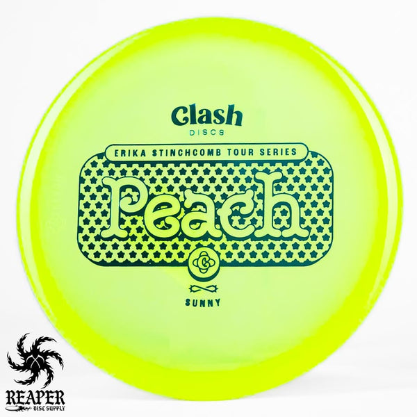 The Clash Discs Sunny Peach Erika Stinchcomb edition is an understable midrange disc designed for high glide and low-speed performance, making it ideal for navigating tight wooded courses.