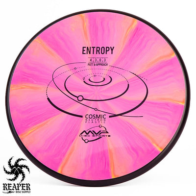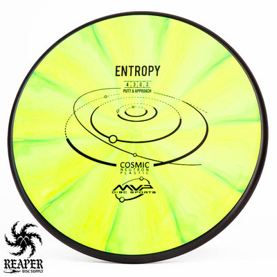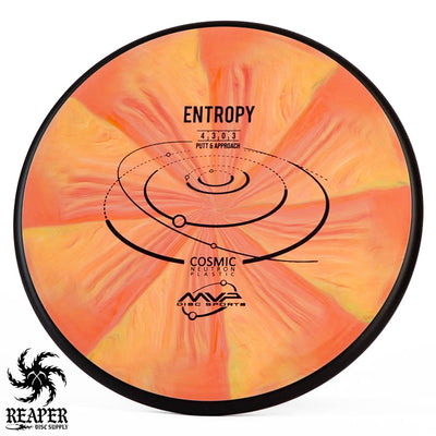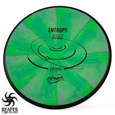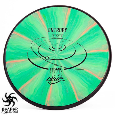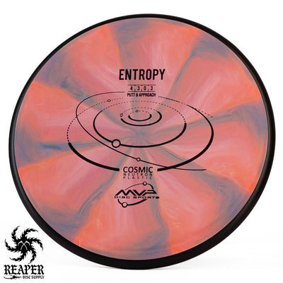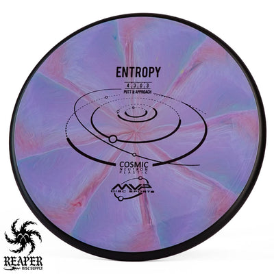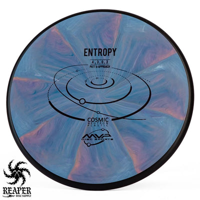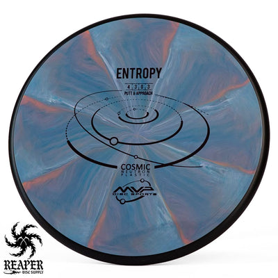 The MVP Cosmic Neutron Entropy is a highly durable, visually stunning approach disc that is perfect for disc golfers looking for reliable control and a dependable finishing fade. This overstable putt and approach disc comes with incredible grip and superior durability. The disc's consistent flight path, ability to withstand high winds, and it's utility on hilly, wooded terrains make it a real game-changer. The MVP Cosmic Neutron Entropy is not just an upshot disc, it's a reliable partner on the course.