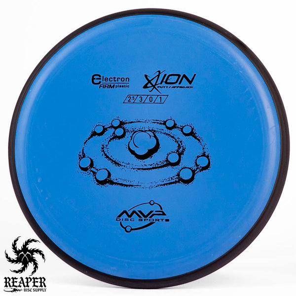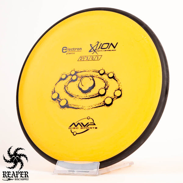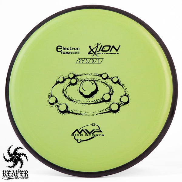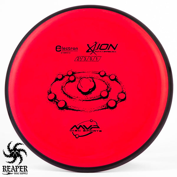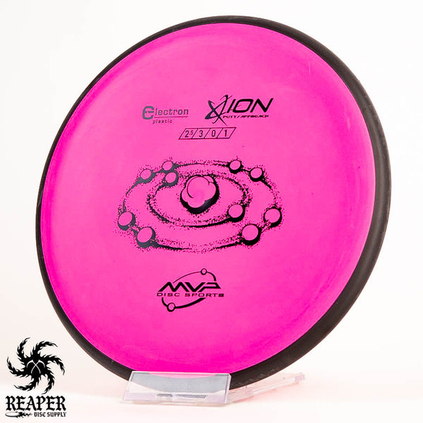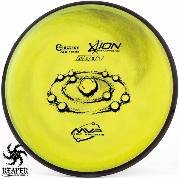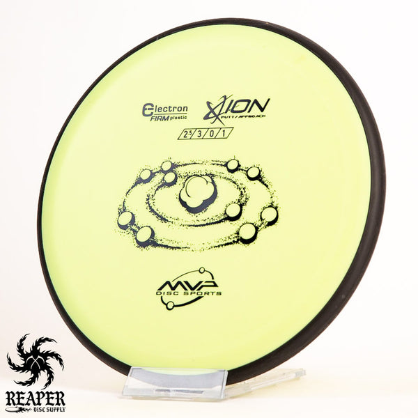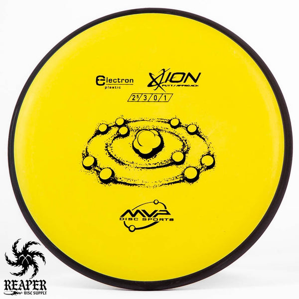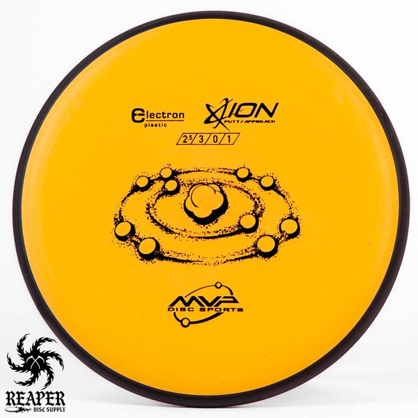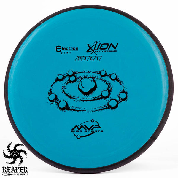 The MVP Electron Ion is a putt and approach disc that is available in Electron Soft, Medium, Firm, and Cosmic Electron plastic. This plastic is extremely grippy and comfortable to hold but isn't the most durable.