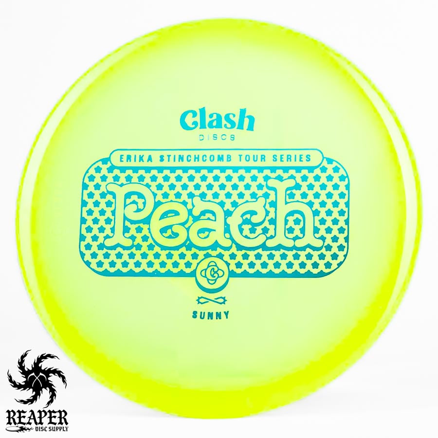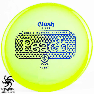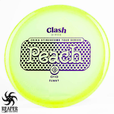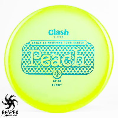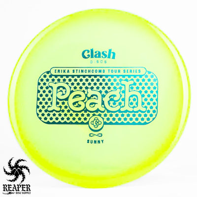 The Clash Discs Sunny Peach Erika Stinchcomb edition is an understable midrange disc designed for high glide and low-speed performance, making it ideal for navigating tight wooded courses.