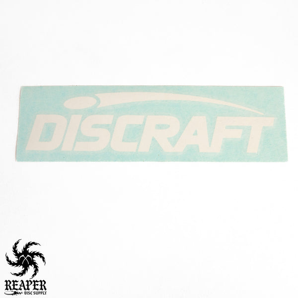 These white vinyl decal stickers feature the Discraft Buzzz logo and are about 5" long. They have a translucent backing that allows you to stick only the vinyl to most surfaces. When you apply the vinyl to whatever surface you want, the clear material around the letters peels off.
