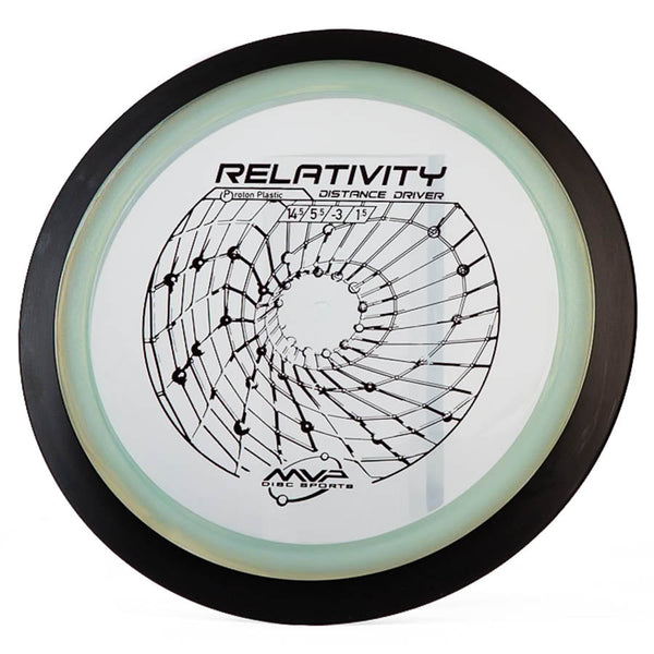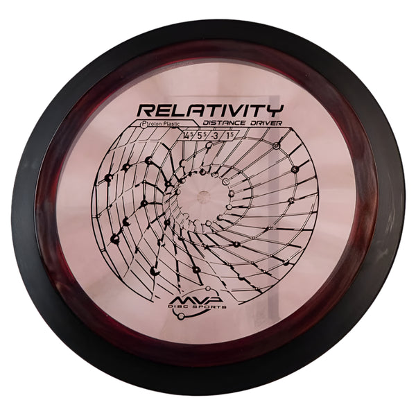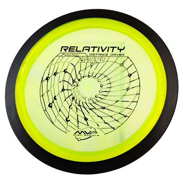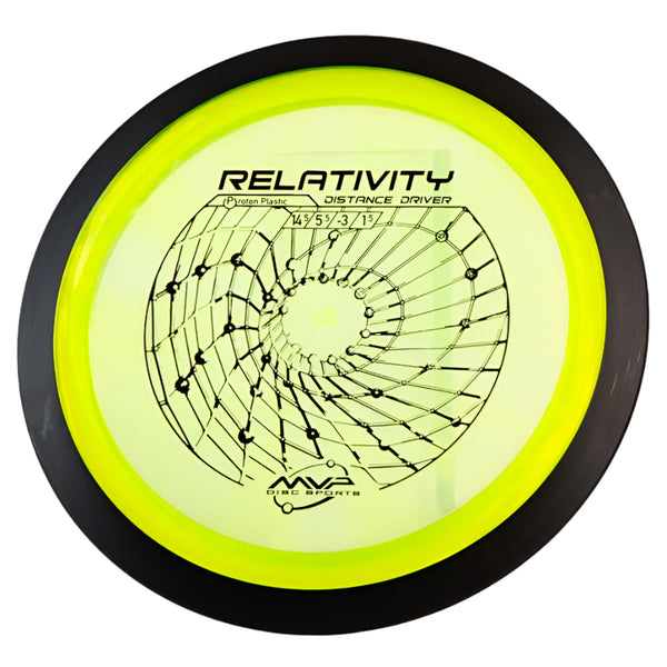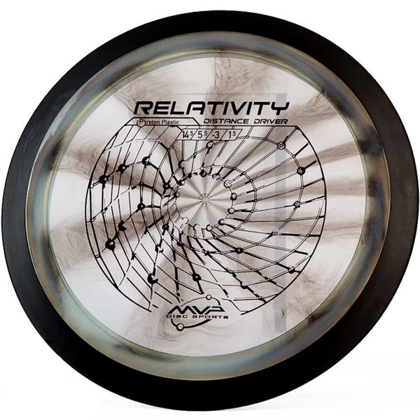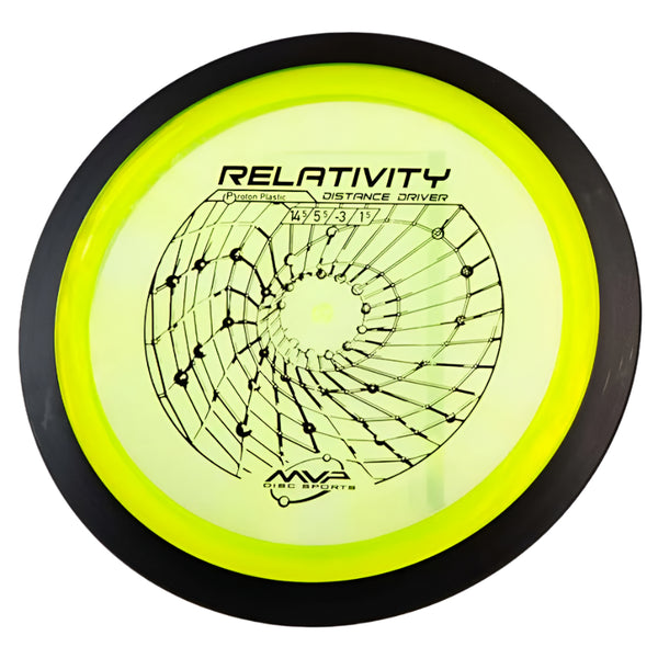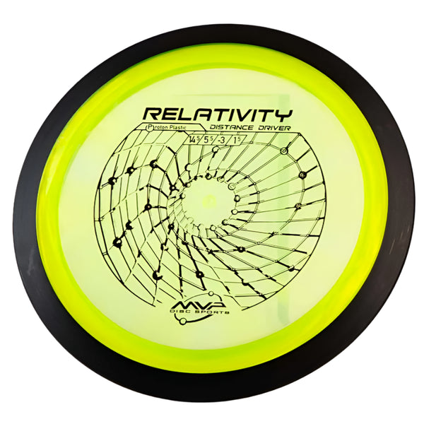 The MVP Proton Relativity is a premium understable distance driver that combines high-speed performance (14.5/5.5/-3.0/1.5) with dependable control, perfect for shaping turnover lines and maximizing distance. Built with MVP's signature two-piece construction, featuring a durable Proton plastic flight plate and black rim, this 24.5mm wide-rim disc delivers consistent flights while preventing unwanted rollers through its reliable fade. Whether you're executing controlled turnovers, strategic rollers, or high-line distance shots, the Relativity's responsive nature caters to both power throwers seeking precision and developing players looking for a forgiving distance driver.