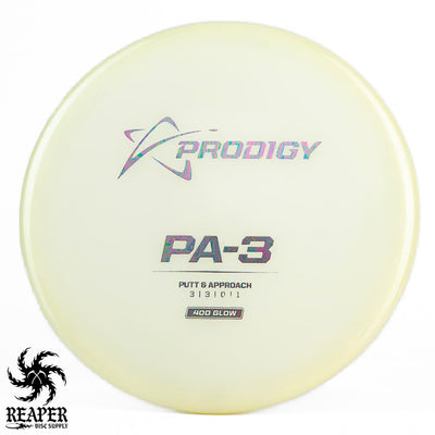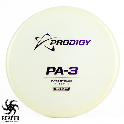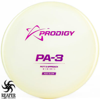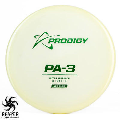 The Prodigy 400 Glow PA-3 is a top-rated putt and approach disc with a stable flight path and a beaded rim for comfort. Made from Prodigy's popular 400 Glow Plastic, it offers excellent durability, a firm grip even in wet conditions, and a stiff rim for controlled throws. Plus, it glows in the dark, adding a fun twist to night games.
