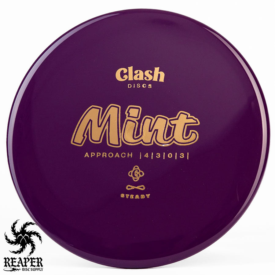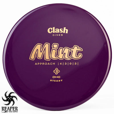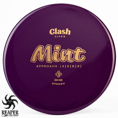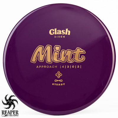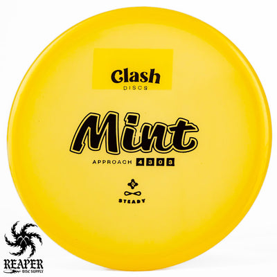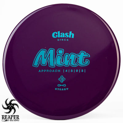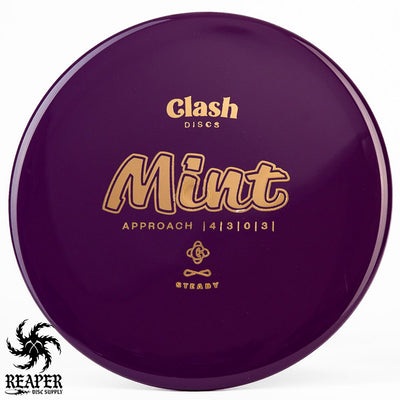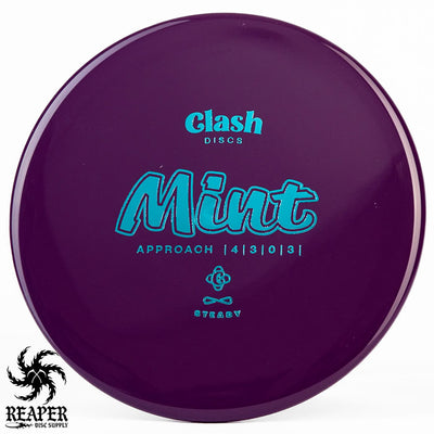 The Clash Discs Mint in Steady plastic is an overstable approach disc that you can rely on no matter how windy it is. Steady plastic is a premium durable plastic that has a very slight waxy feel while still offering great grip for both forehand and backhand shots.