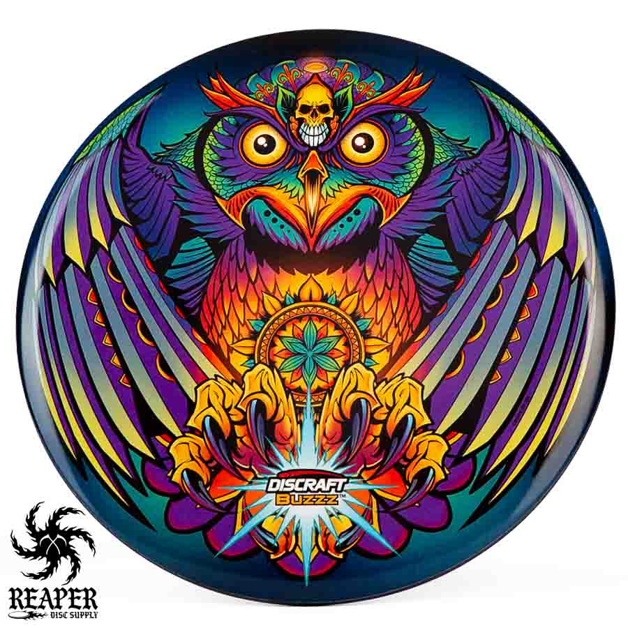 Brian Allen designed the illustration on this Discraft Supercolor 'Owl' Buzzz, which features a vibrantly colored bird and it's talons.