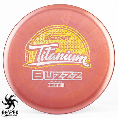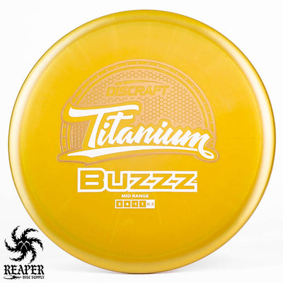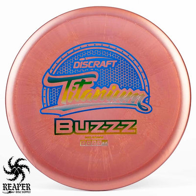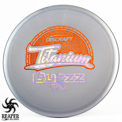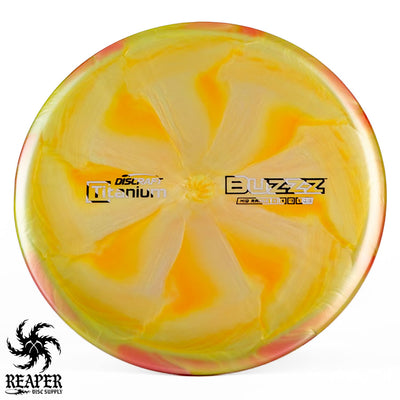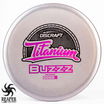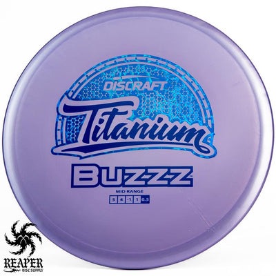 The Discraft Titanium Buzzz is a stable midrange made with gorgeous shimmery plastic and a two color stamp. Titanium plastic is a stable, somewhat firm premium plastic that can handle lots of damage and maintain its stability. The Titanium Buzzz is a fantastic addition to any player's bag, regardless of skill level.