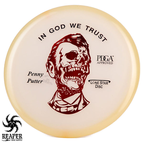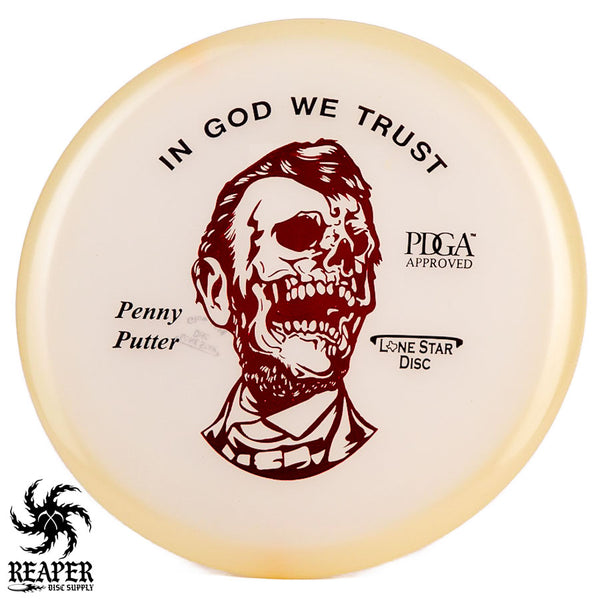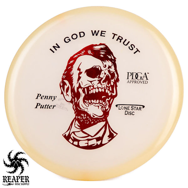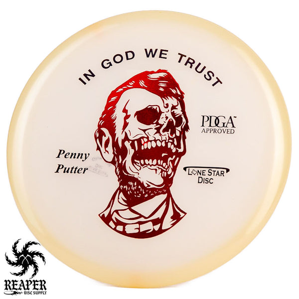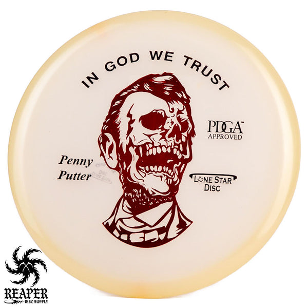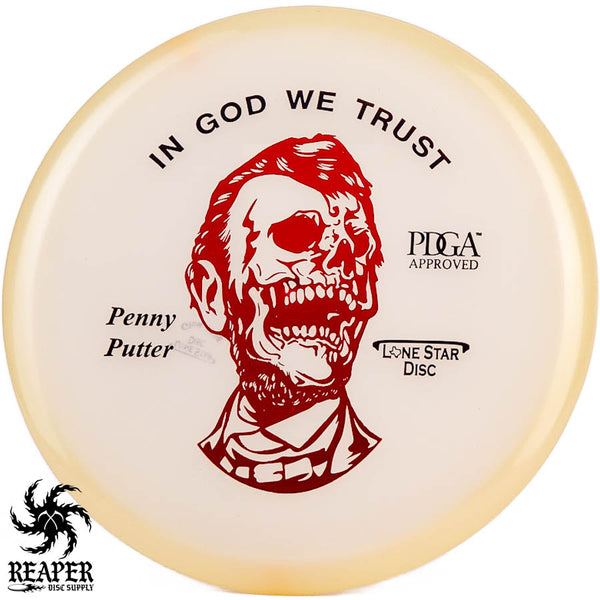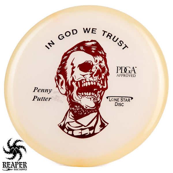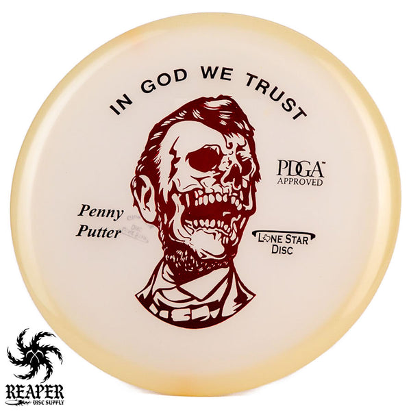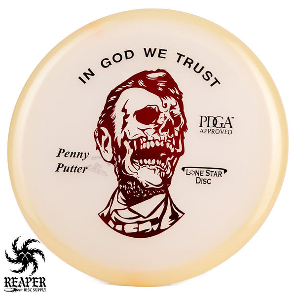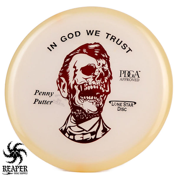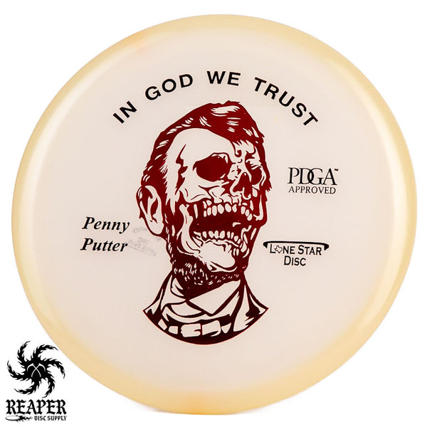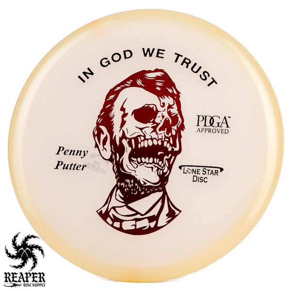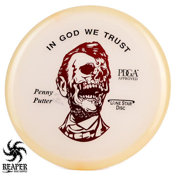 Get into the Halloween spirit with the Lone Star Discs Glow Penny Putter. This limited edition disc is perfect for those spooky night rounds. Featuring a dependable, neutral flight with a touch of fade, the Penny Putter is ideal for navigating wooded courses, hitting tight gaps, and executing precise upshots. With its glow-in-the-dark design, you can keep the game going even after the sun sets. Don't miss out on this Halloween treat - grab the Lone Star Discs Glow Penny Putter and light up the course with your skills.