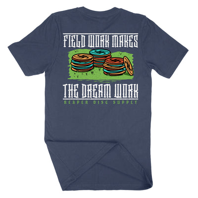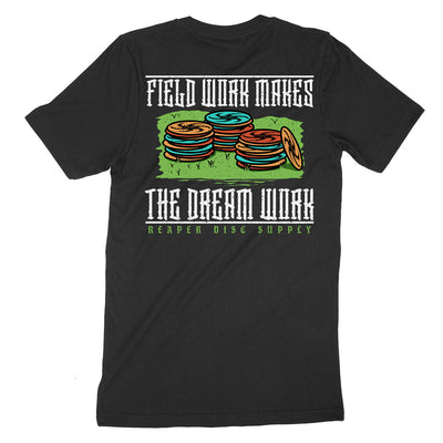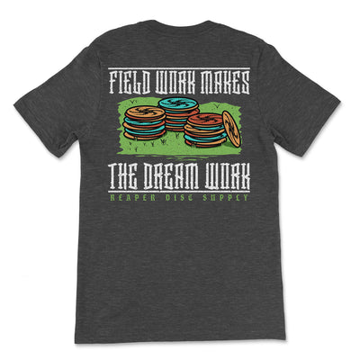Looking for a new look for your next round of disc golf? Our Field Work t-shirt is the perfect fit. With our signature spiral logo on the front and the quote “Field Work Makes the Dream Work” on the back, you'll look dope for your next round of disc golf.