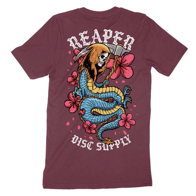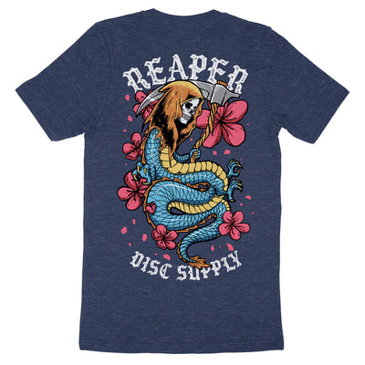 Introducing our 'Floral Dragon Reaper' t-shirt: half dragon, half reaper, fully badass! This hand drawn Japanese inspired shirt is available in black, maroon, and heather navy to match your mood.