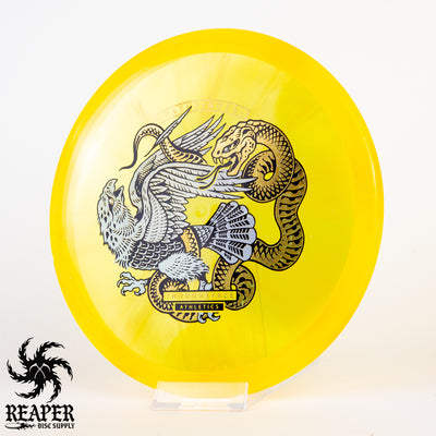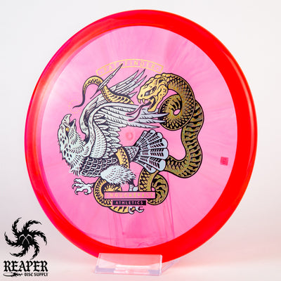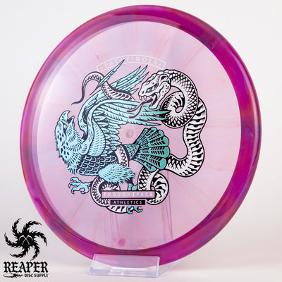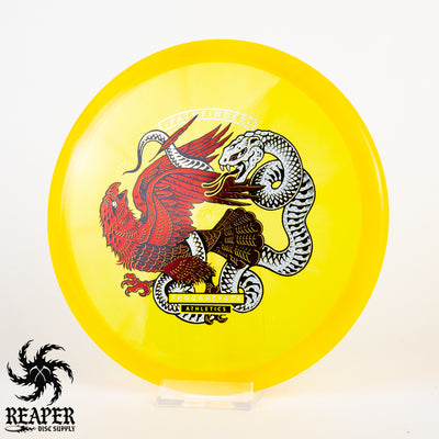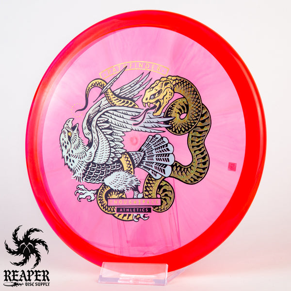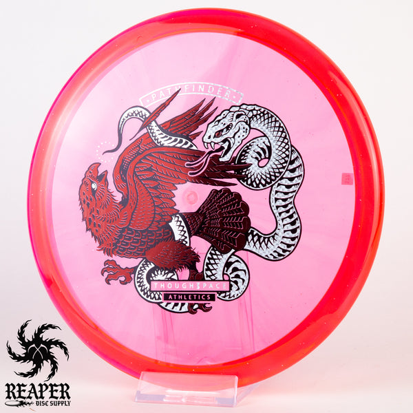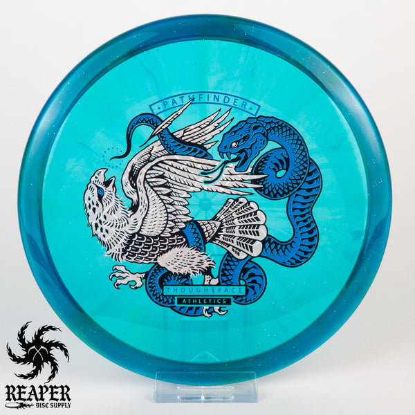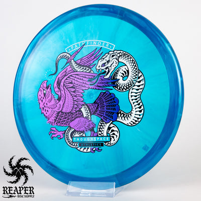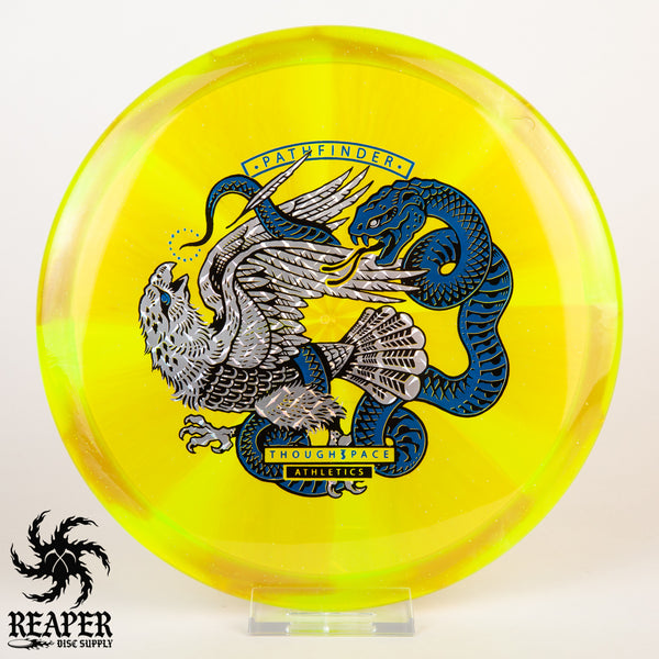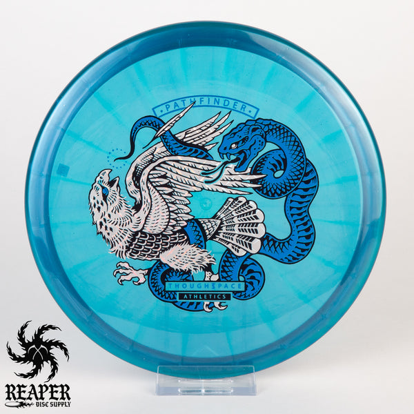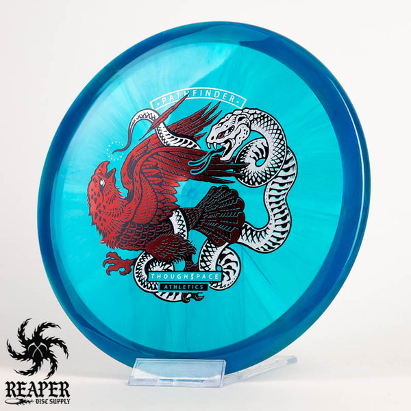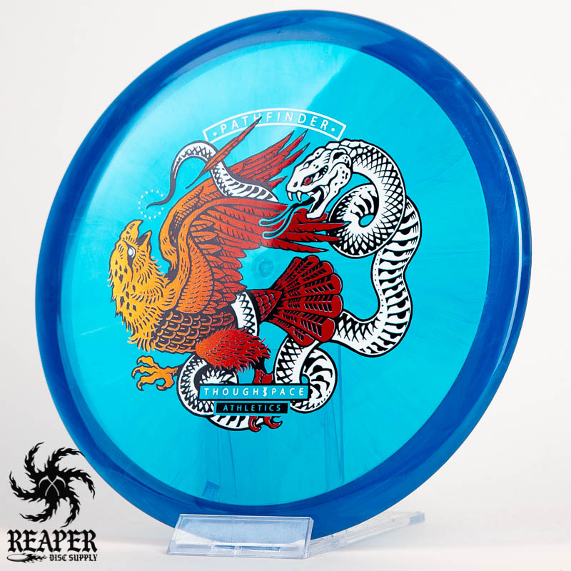 The Thought Space Athletics Ethos Pathfinder is not only an incredible flying midrange disc, but may just have the coolest stamp in existence. The snake and bird combo has been done so many times, but none better than this design. With incredible color combinations and stamp foils, what's not to love about this beautiful midrange?