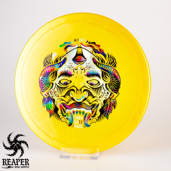 The Thought Space Athletics Ethereal Votum is a stable 9-speed driver with an awesome double-sided stamp. The Ethereal plastic feels similar to Discraft's Big Z plastic, and the small rim fits nicely in hand. Ethereal plastic is very durable and takes a long time to beat-in.