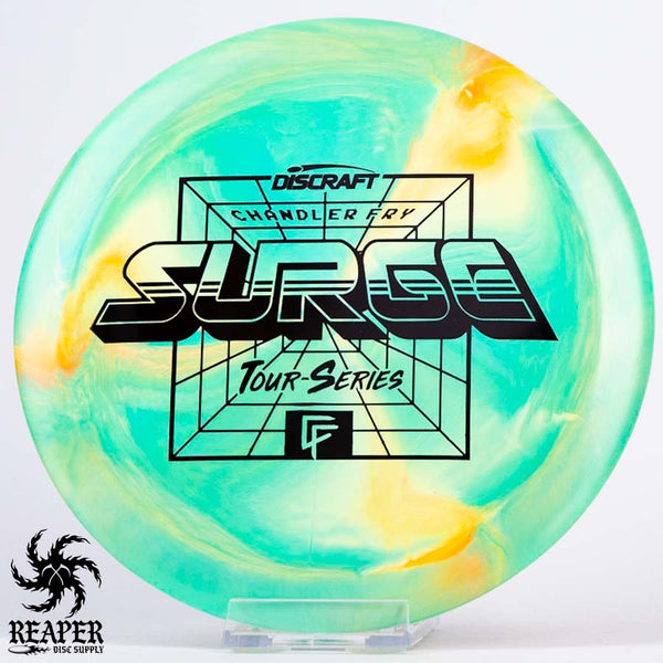 Crush your next drive with Chandler Fry's Tour Series Surge! Made with Discraft Swirly ESP plastic, this overstable driver deserves a place in your bag.