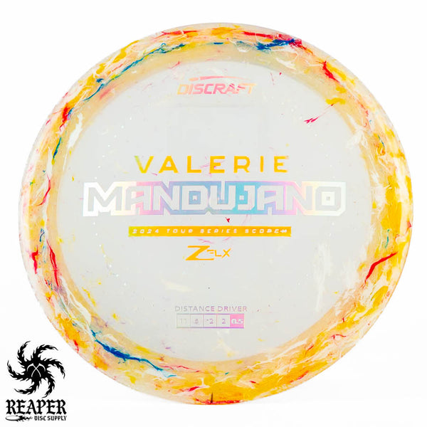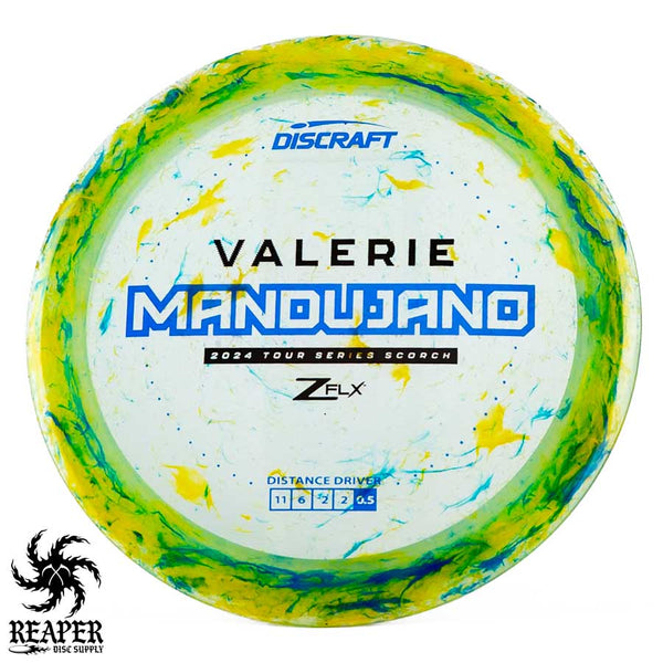 The Discraft Z FLX Scorch is a versatile distance driver, now available in a unique translucent, Jawbreaker-colored plastic that offers more flexibility than traditional Z plastic. This 2024 Tour Series disc features Valerie Mandujano's signature, with a portion of each sale directly supporting her journey on the Disc Golf Pro Tour. Known for its high glide and controllable turn, the Z FLX Scorch provides exceptional grip and durability. Perfect for players seeking to achieve long, consistent flights, this disc combines performance with a standout look on the course.