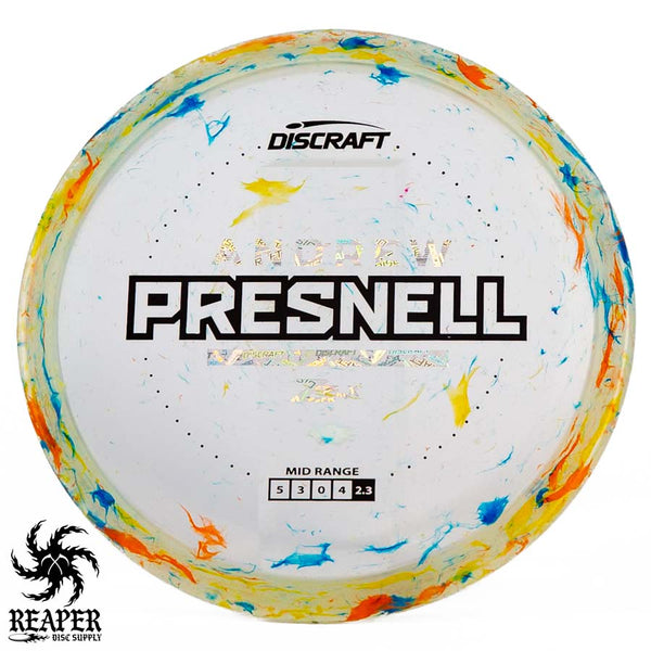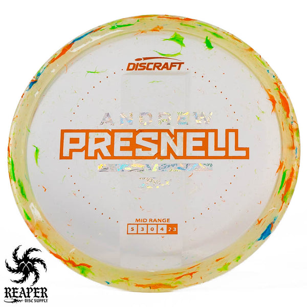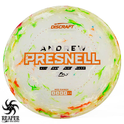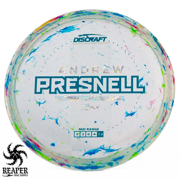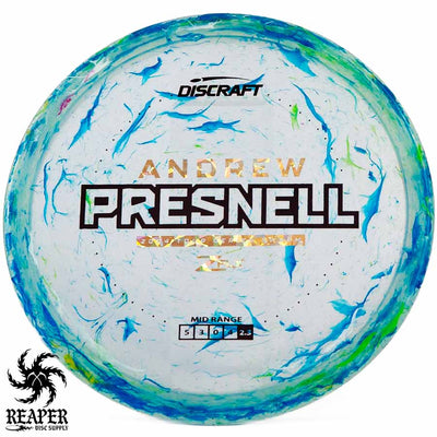 The Discraft Z FLX Storm is an overstable midrange, now available in a unique translucent, Jawbreaker-colored plastic that is more flexible than traditional Z plastic. This 2024 Tour Series disc features Andrew Presnell's signature, with a portion of each sale directly supporting his journey on the Disc Golf Pro Tour. Ideal for straight shots and controlled turnovers, the Z FLX Storm offers excellent grip and durability, making it perfect for players seeking consistency and reliability. Its distinctive plastic blend ensures both style and performance on the course.