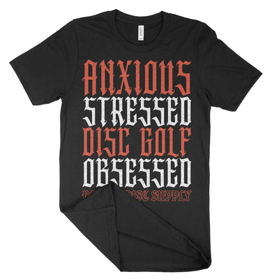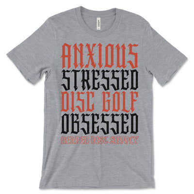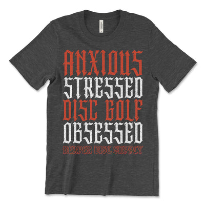 Some people may not relate to our Anxious Stressed Disc Golf Obsessed t-shirt, but thats fine. We made it for ourselves. This hand stenciled shirt is available in four different colors: black, athletic heather, dark grey heather, and heather navy. Dark grey heather is my personal favorite.