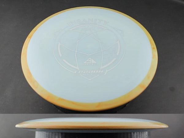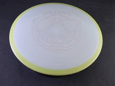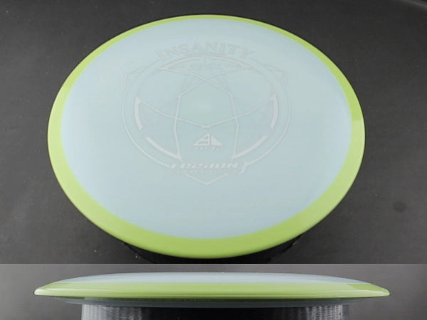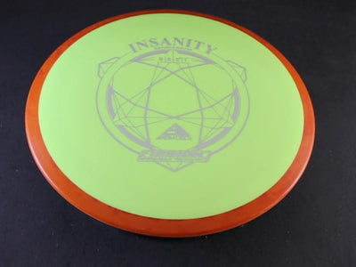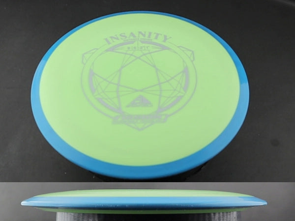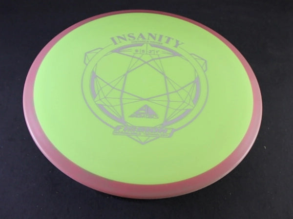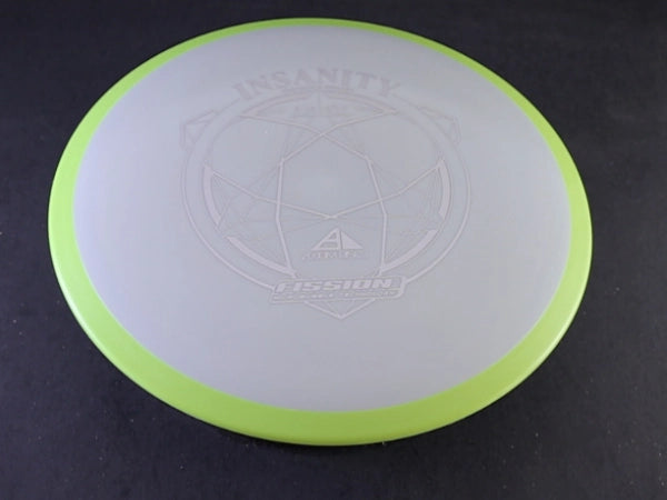 The Insanity is Axiom's 9-speed understable distance driver, and Fission is about as premium as Axiom's plastic lineup gets. Fission uses a gummy inner core wrapped in a grippier outer shell. Soft in the hand, firm on the rim, and it holds its flight longer than the lighter blends.