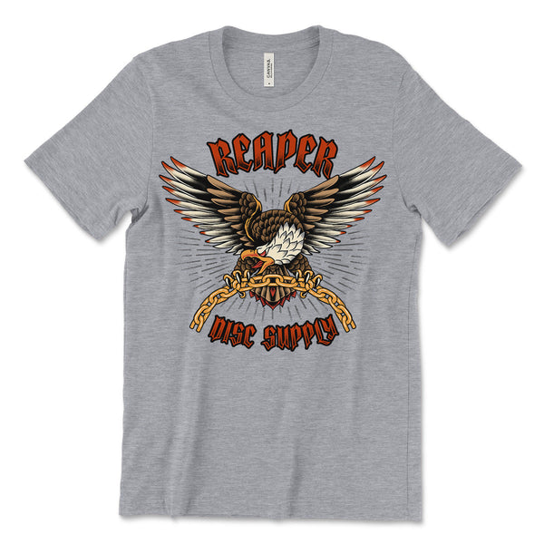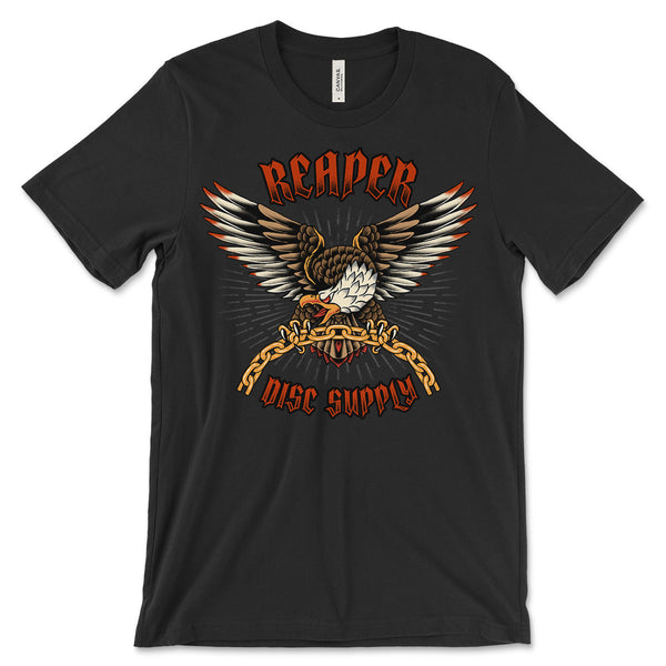 Spread your wings and 360 huck a disc down the fairway in our new 'Chained Eagle' t-shirt. Part of our chained collection and available on black, white and athletic heather tees.
