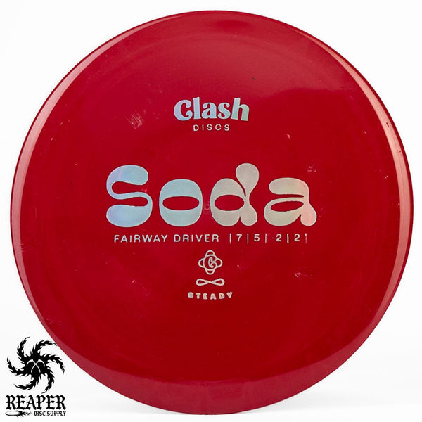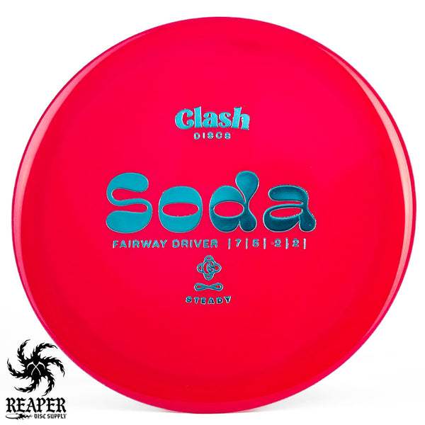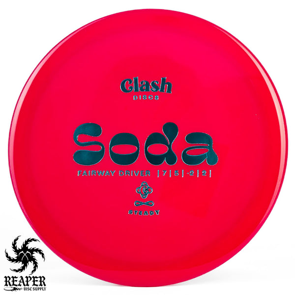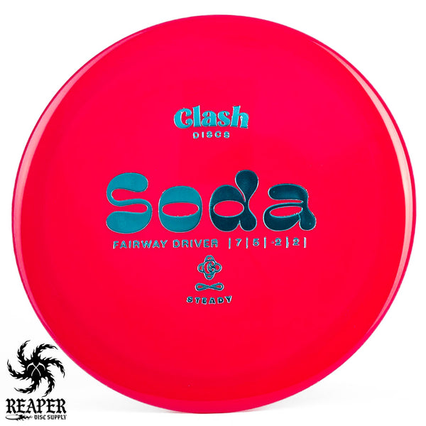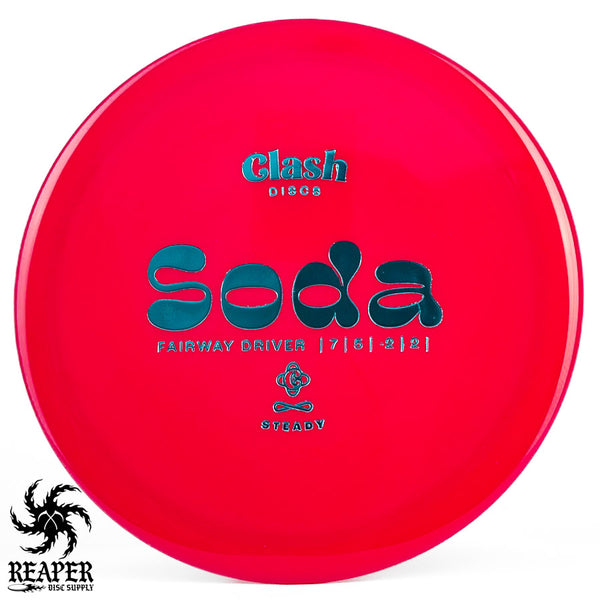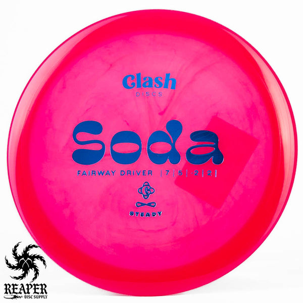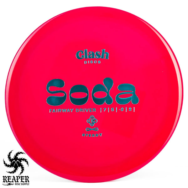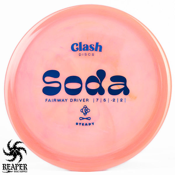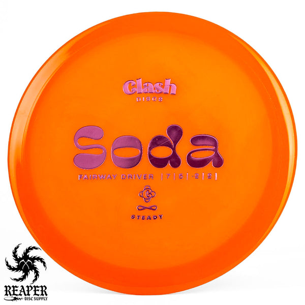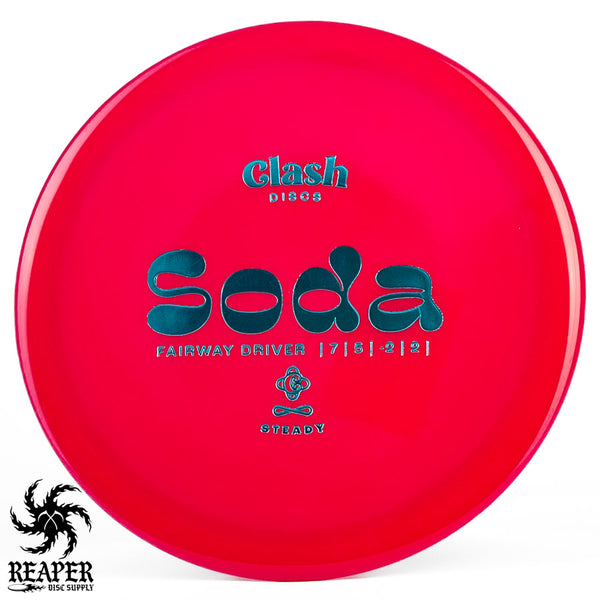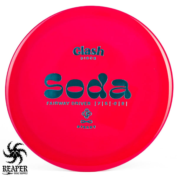 The Clash Discs Soda in Steady plastic is a beginner-friendly fairway driver with a small rim profile and a ton of glide. This disc is an excellent first driver for beginner players; it is very easy to control, it doesn't require a lot of power, and you can shot shape with it rather effortlessly. If you are a new player struggling to get more distance then this stable to understable fairway driver may be the perfect solution. It flies similarly to the Innova Leopard but with a smaller rim which is much easier to control.