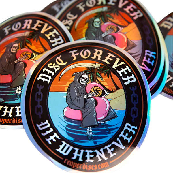 What screams "disc golf" more than a grim reaper sitting on a pink flamingo pool floatie next to some palm trees? We couldn't think of anything else either so we made these holographic stickers.