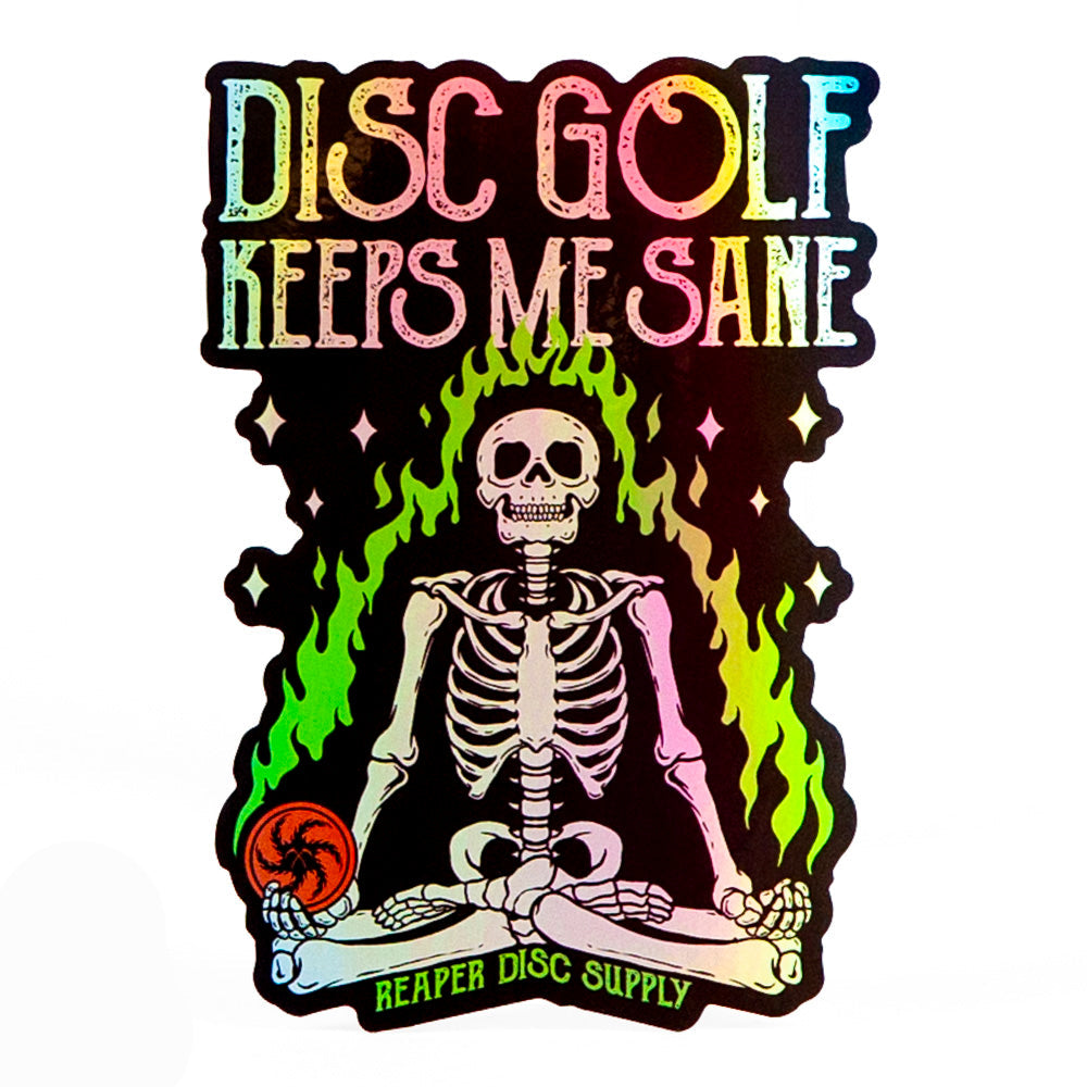Featuring a meditating skeleton holding a R.E. disc, these 'Disc Golf Keeps Me Sane' holographic stickers are for anyone who considers disc golf therapy.