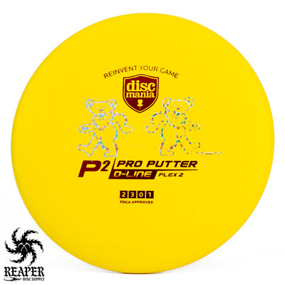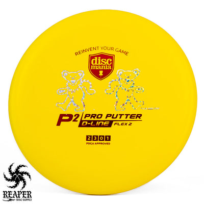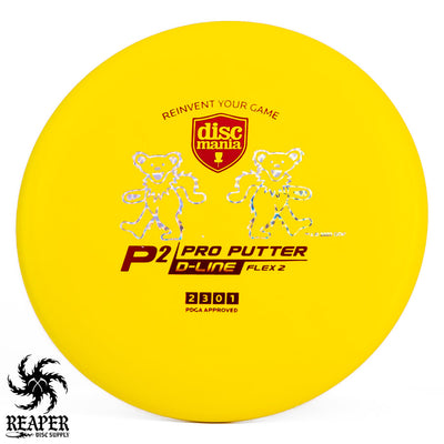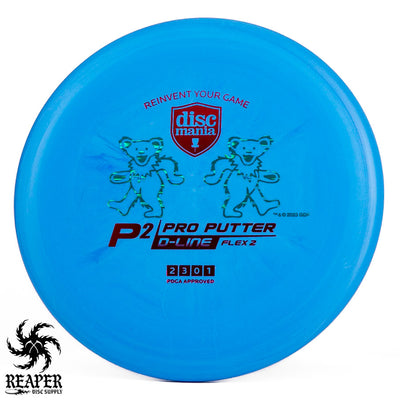 Experience the limited edition Discmania Grateful Dead D-Line Flex 2 P2. This collaboration blends performance with iconic style. Crafted with soft D-Line Flex plastic, this P2 putter offers reliable throws. Featuring the iconic dancing bears stamp, it's a must-have for Grateful Dead fans and avid disc golfers.