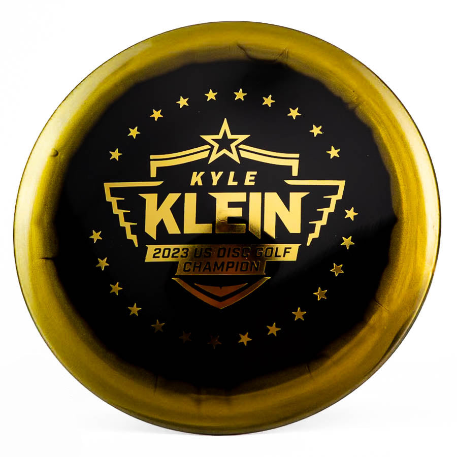 The Kyle Klein Horizon Vanguard is a special edition fairway driver celebrating Kyle Klein's victory as the 2023 United States Disc Golf Champion. This golden-themed disc, part of the Creator Series, features a black flight plate, golden rim, and gold foil stamps, offering a unique and premium design.