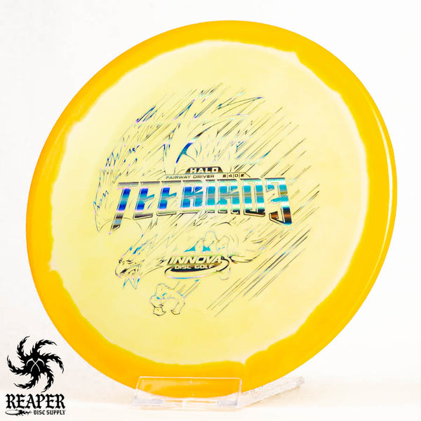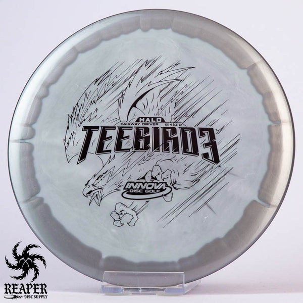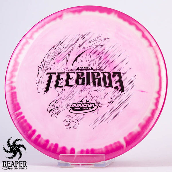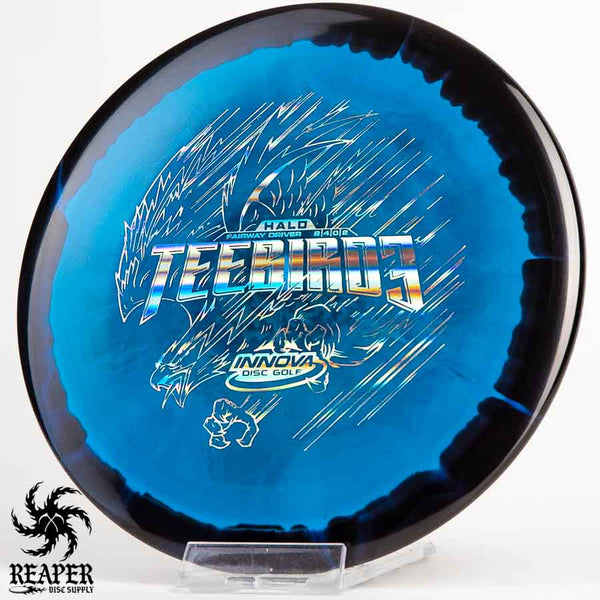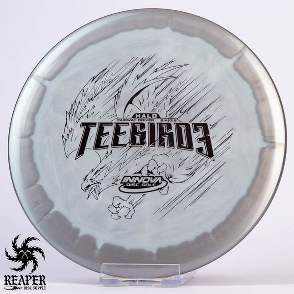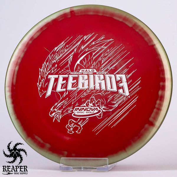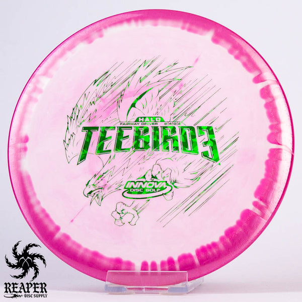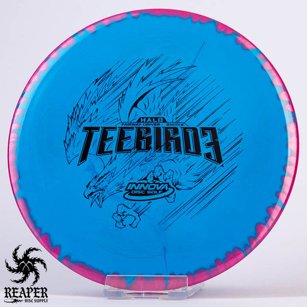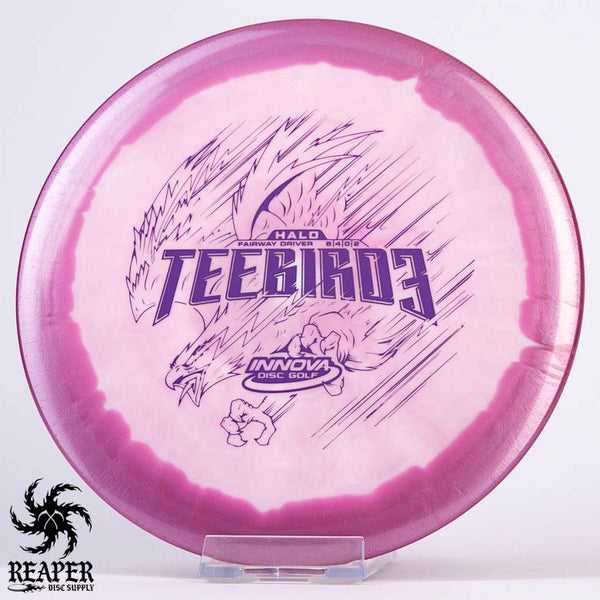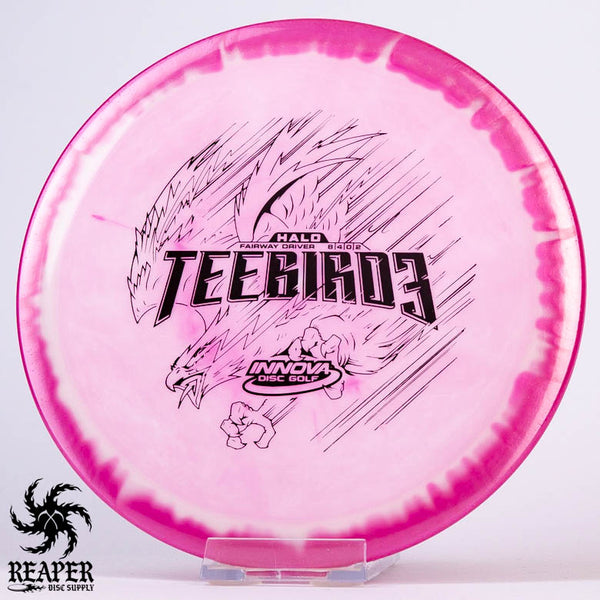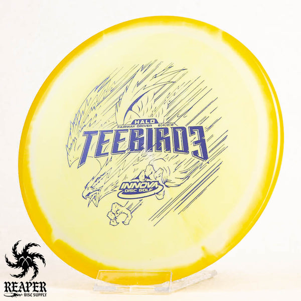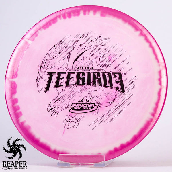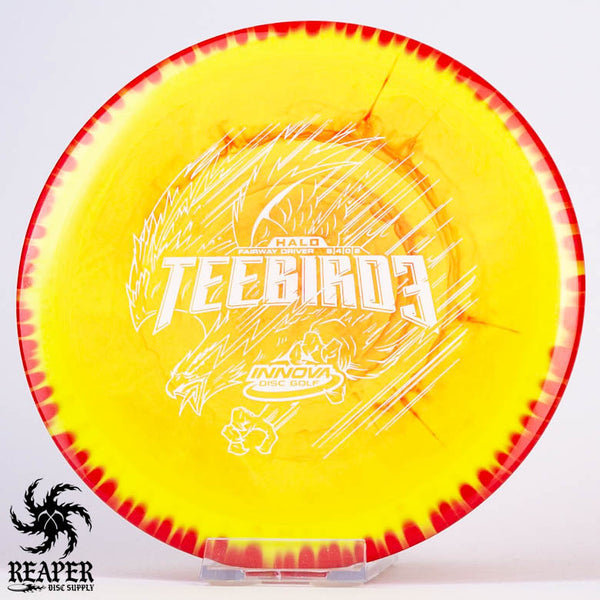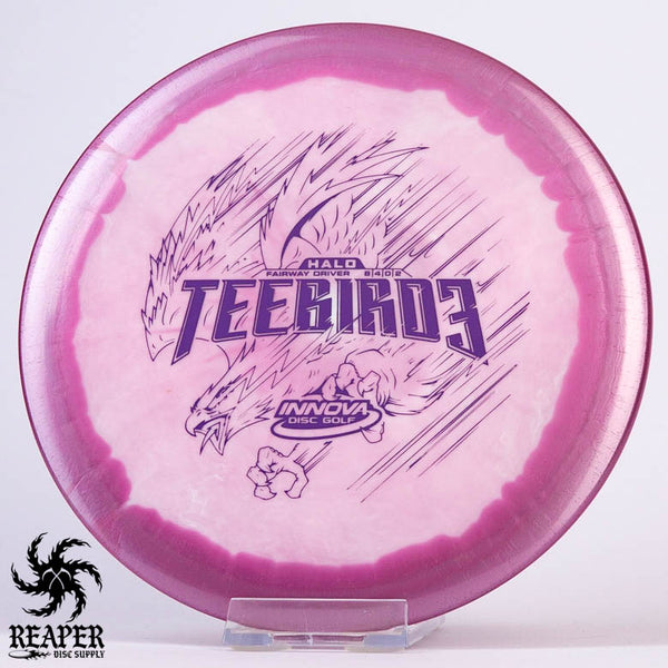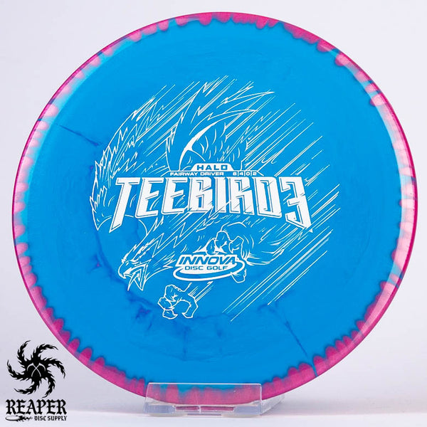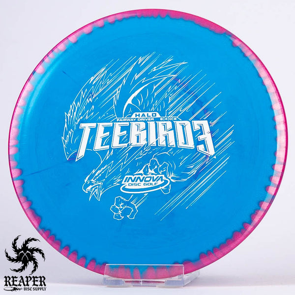 Innova's Halo Teebird3 is a stable to overstable fairway driver that comes in incredible color combinations and a dope stamp! The Halo Star plastic is more overstable than traditional Star plastic so the stability on these Teebird 3's is probably closer to 2.5 or 3 fade instead of 2.