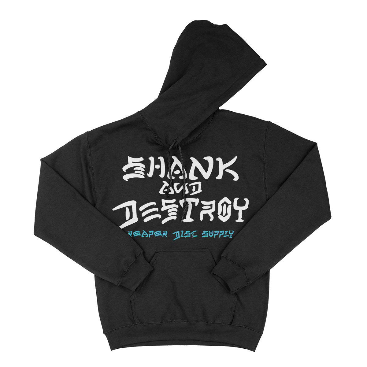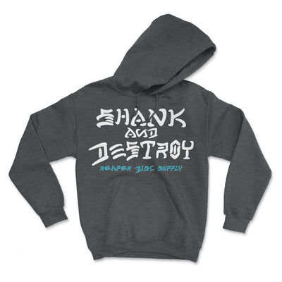 Our 'Shank and Destroy' disc golf hoodie is for everyone else who can't keep their disc in the fairway. These hoodies are super soft and comfy and tend to run a little on the larger side. You can check out our size chart below. Available on black, blue, and dark heather grey (the softest) hooded sweatshirts.